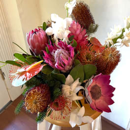 Price: $375.00 A large Grand display of tropical blooms & cottage flowers Product Tags: Next-day Delivery