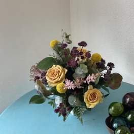 Price: $250.00 designers choice Low and compact centerpiece arrangement with rose gold accentaccents Product Tags: Next-day Delivery