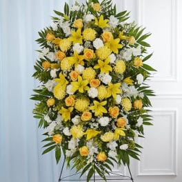 Price: $700.00 Heavenly spray of yellow roses and yellow pincushions Easel Product Tags: Next-day Delivery